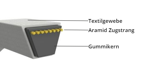 Der Aramid/Kevlar Zugstrang im Kupplungsriemen ist besonders Dehnungsarm und strapazierfähig. Das ist daher besonders sinnvoll, da wir diesen Riemen rückenseitig mit einer Rückenspannrolle belasten. Ein "normaler" Gummi Keilriemen ist für diese Anwendungen daher nicht geeignet.