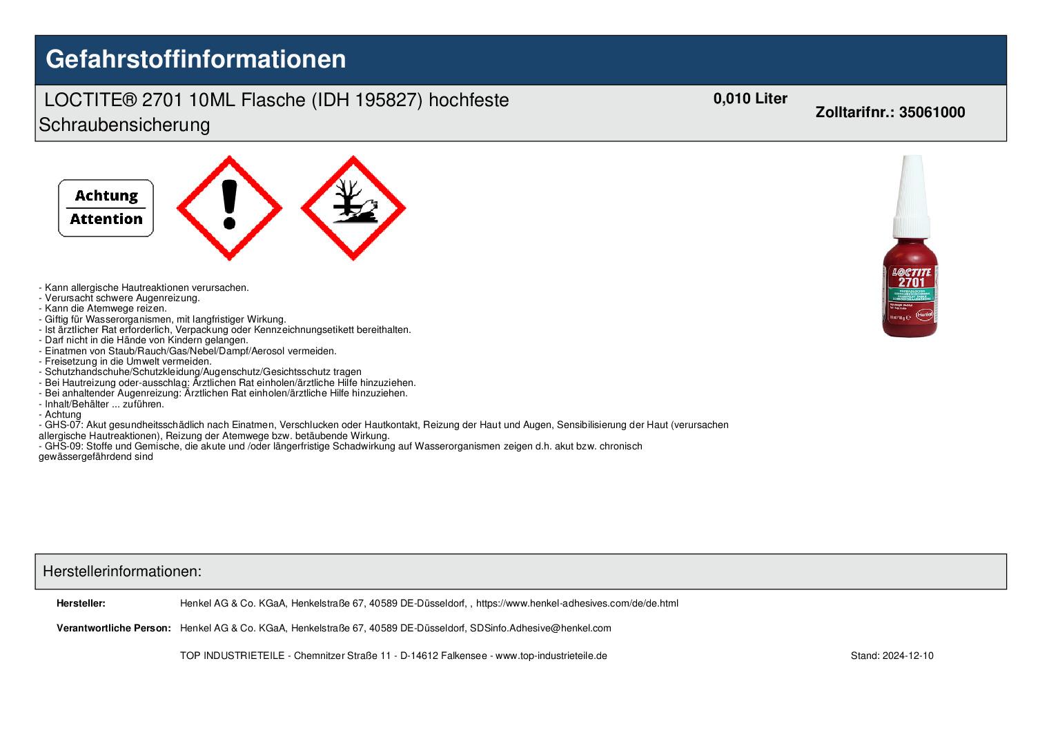 Hochfeste, niedrigviskose, grüne Schraubensicherung auf Methacrylatbasis. Produktüberwachung durch Fluoreszenz unter UV-Licht. LOCTITE® 2701 ist eine grüne, niedrigviskose Schraubensicherung auf Methacrylatbasis für hochfeste Verbindungen, besonders für verchromte Flächen. Handfestigkeit in 10 Minuten auf Stahl, 4 Minuten auf Messing und 25 Minuten auf Edelstahl. Toleriert geringe ölige Verschmutzungen durch Industrieöle. Geeignet für alle Gewindeverbindungen aus Metall. Fluoresziert unter UV-Licht.