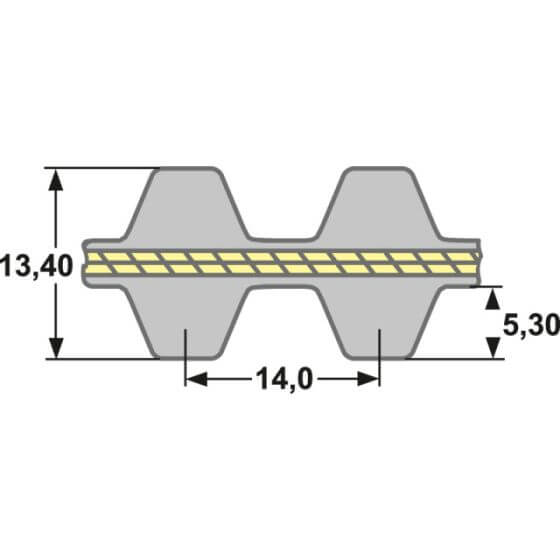 Doppelzahnriemen besitzen eine beidseitig Verzahnung und können von der Ober- sowie Unterseite die gesamte Antriebsleistung übertragen. Ihre Anwendung finden Sie hauptsächlich, um einen Drehrichtungsumkehr im Antrieb zu realisieren. Sie zeichnen sich neben einer hohen Leistungsübertragung durch einen ruhigen Lauf und einer große Flexibilität aus und können auf auf sehr kleine Riemenscheiben eingsetzt werden durch die hohe Biegewilligkeit.Dimensionen: